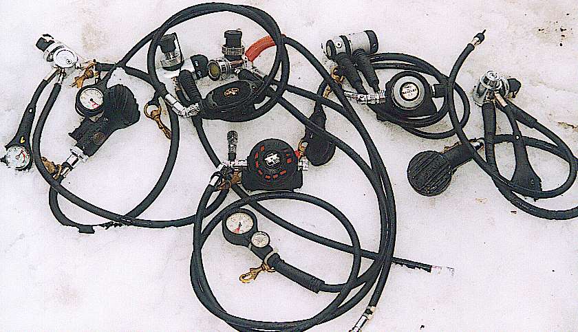 De gauche à droite, Dacor Vyper avec sa chambre pleine d'huile de silicone, Apeks TX50 avec sa chambre sèche, Scubapro avec le système TIS et le radiateur |