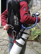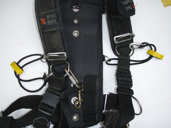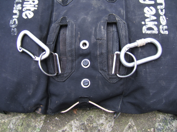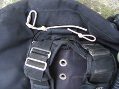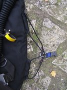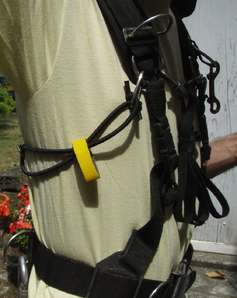 -J'ai récemment remplacé DIVERS / PETIT MATERIEL: -Pour la fixation des blocs, tous ont un bout de "Daisy chain" d'escalade (photo 13) = deux longueurs de fixation. Ca permet une fixation qu'on peut couper si besoin. Les deux longueurs permettent d'allonger la fixation facilement sous l'eau : le bloc "pendra" alors un peu plus, presque en ventral -pas forcément indispensable, je l'ai monté ainsi pour un siphon en diaclase étroite où les blocs strictement en latéral raclaient sur les cotés (une étroiture à l'entrée interdit le dorsal dans ce réseau). -Il me semble que le confort de la configuration dépend beaucoup du point d'attache sur les blocs : les cerclages sont bien positionnés lorsqu'ils se situent approximativement au centre de gravité des blocs (en les tenant par la Daisy Chain, ils pendent à l'horizontale). -En bas du harnais sur le dos, deux élastiques ont été ajoutées, et permettent d'y accrocher dévidoir, boyon du phare, petit matériel... -Sur chaque bloc, un anneau sur le cerclage permet aussi de fixer du matériel (pochette post-siphon par ex). -La sangle d'origine entre les bretelles, peu fiable, a été remplacée par un maillon rapide où sont fixées quelques caouèches (photo d'ensemble).
