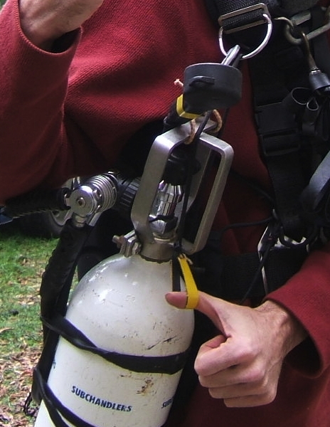 HAUT DES BLOCS: -Ils sont mousquetonnés sur les anneaux des épaules. Une élastique(*) dans cet anneau permet de "coiffer" le bloc et plaquer le haut contre soi (photos 11 et 12): avec le robinet + le détendeur + la protection de robinetterie, le bloc a tendance à se tanquer dans la glaise (mais si la cavité n'est pas trop étroite, en général je ne les utilise pas, et ramène juste le haut des blocs avec les mains pour les passages plus bas). (*) sur la photo d'ensemble: élastique noir avec un anneau jaune (pour la saisir facilement avec des gants).