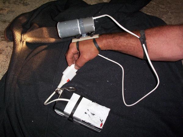 Un petit morceau de plastique dur de 3mm de forme arrondie, pour bien englober le dessus de la main, percer sur les quatre angles afin d'y glisser nos petits bouts magiques de chambre à air. Et pour fixer la lampe une accroche tube situé sur le centre.
