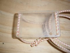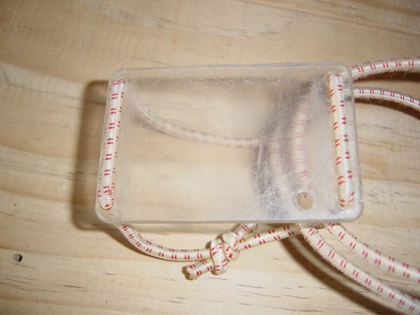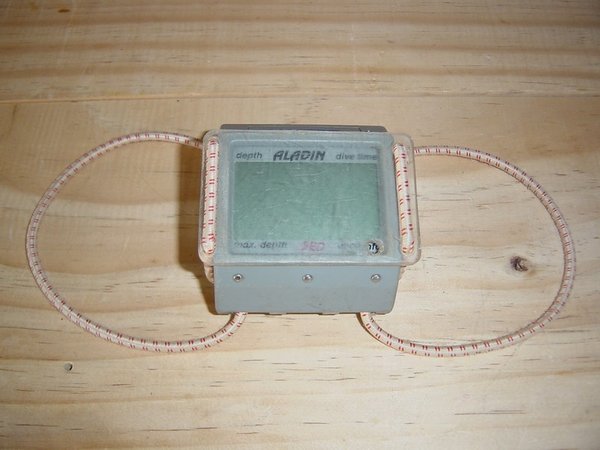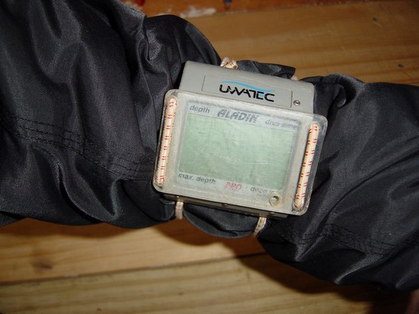 Quelques modifications apportées a cet ordinateur pour l'usage un peu « costaud » en plongée souterraine. La réputation de robustesse du bracelet d'origine n'a pas du dépasser les murs du bureau d'étude d'Uwatec en Suisse… C'est pourquoi, je l'ai remplacé par des élastiques 4 mm achetés en magazin d'accastillage. 2 boucles indépendantes avec nœud de pêcheur simple qui sont passées sous les tiges inox du capot arrière. Ces tiges se démontent avec un chasse goupille fin et un marteau. Une des 2 boucles a un diamètre légerement superieur a l'autre pour mieux épouser la forme conique de l'avant bras ( juste un peu maniaque parfois…). En cas de rupture d'une des tiges ou de l'un des élastiques, vous ne perdrez pas l'ordinateur, ce n'est pas le cas pour la rupture du bracelet d'origine… L'inconvenient reste que ce n'est plus réglable… Mais j'ai peu de différence de grosseur entre l' étanche et l'humide avec une sur-combi speleo. 2° modif, l'ajout d'un protecteur d'écran. Celui-ci a été réalisé dans une chute de polycarbonate épaisseur 3 mm. Les dimensions sont de 75 x 50 mm avec 4 percages aux angles, une boucle en élastique vient « ceinturer » l'ordi. Un percage sur le bas de l' écran pour que l'eau puisse s' échaper, ça évite la formation de bulles entre l' écran et le protecteur et ainsi gêner la lecture. Sur les photos, on voit que le protecteur est bien rayé, mais sous l'eau les rayures ne se voient plus.
