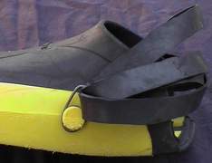 Le fond de la partie chaussante est entaillé (mais l'extrémité solidarisée par un collier) afin d'évacuer l'argile et le sable collés sous les chaussures après une progression post-siphon.
