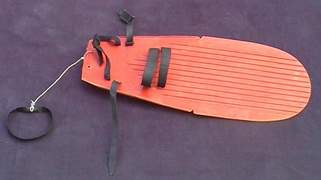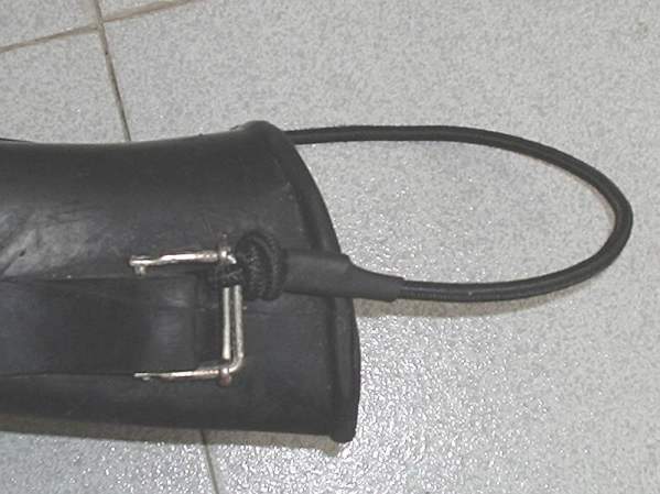 Initialement, on utilisait une " longe ". Un morceau de cordelette fixé à la palme d'un côté, à un anneau de chambre à air de l'autre. L'anneau, passé autour de la cheville du plongeur, solidarise la palme avec sa jambe. Il peut la retrouver en cas de rupture de sangle ou de la fixation pour effectuer une réparation ou un bricolage à l'air libre si une surface est proche, mais difficilement l'utiliser pour se " rapatrier " si le siphon est long.