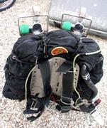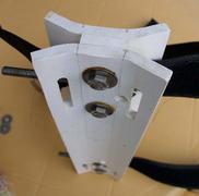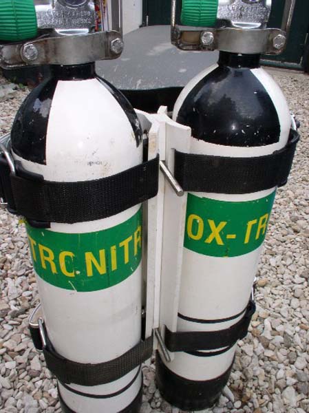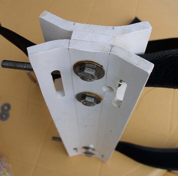 en pvc épaisseur 1 cm. Entre-axe des tiges filetées pour une plaque OMS, visserie inox. Je monte indifféremment des blocs de 6 à 18 litres (je n'ai pas de 20 litres). ça m'a coûté 10 euros sans les sangles mais je ne le commercialise pas.