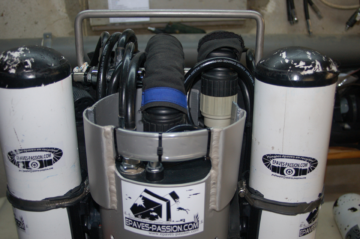 La forme de la frame protège entièrement la tête et le canister. Toutes les parties sensibles du recycleur sont bien à l'abri à l'intérieur de la frame et ainsi parfaitement protégé du milieu extérieur où peut évoluer le plongeur. La "négociation" d'étroitures sévères en plongée souterraine, ou les tôles déchirées de certaines épaves ne pourront pas atteindre la tête ou le canister dans son cocon d'aluminium!
