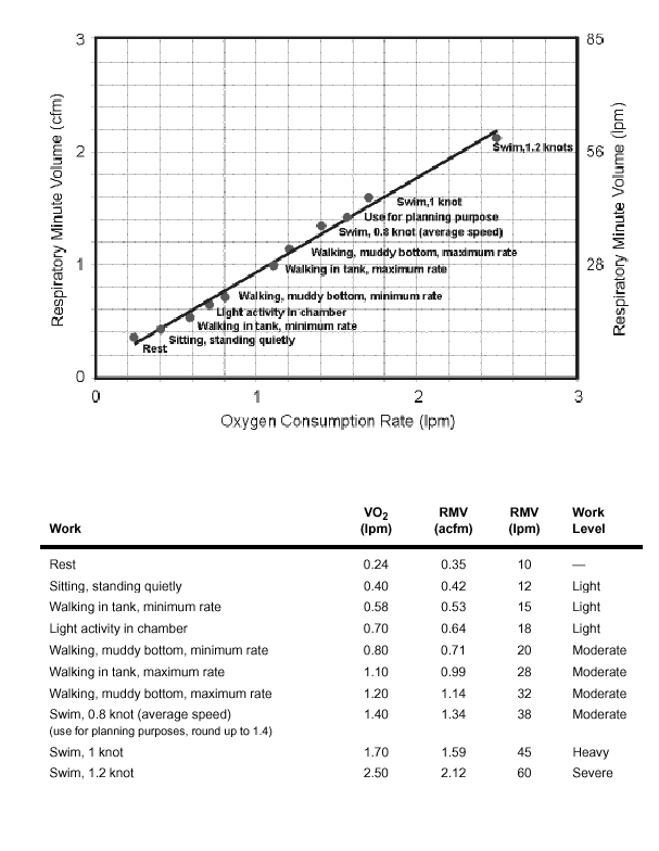 Consommation d’oxygène en fonction des efforts (source US Navy)
