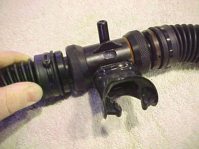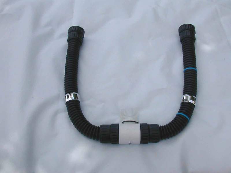 et l’embout : Premiers composants de la boucle, ils permettent de récupérer le gaz qui vient d’être expiré par le plongeur. Aujourd’hui, la plupart des constructeurs s’accordent sur la technique éprouvée d’un tuyau annelé d’inspiration et d’un tuyau annelé d’expiration. La forme modelée (canules) des tuyaux est destinée à prévenir leur écrasement et à permettre les mouvements de la tête. Ils sont montés autour d’un embout équipé de soupapes anti-retour. Elles permettent ainsi une circulation du gaz en sens unique pour ne pas mélanger le gaz chargé de CO2 avec celui qui vient d’en être épuré, après son passage au travers de l’absorbant de CO2. Même si des détrompeurs mécaniques et des repères de couleur sont prévus afin de ne pas se tromper lors du montage après un entretien, une vérification avant la plongée est très fortement conseillée. Un dispositif permet de fermer l’embout de manière à éviter toute entrée d’eau si celui-ci venait à être retiré en immersion. |