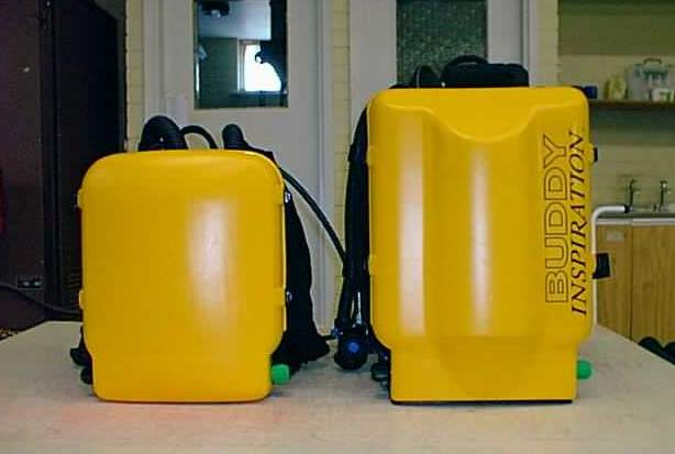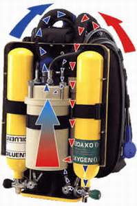 On dénomme ces systèmes passifs car l’ajout de gaz n’est pas automatique. Il est déclenché de manière mécanique par la ventilation. Ces recycleurs fournissent en quelque sorte du gaz frais à la demande. Ce type de matériel offre un avantage important comparé au recycleur semi fermé de type actif : il est moins sujet à générer une hypoxie. La moindre défaillance du système demandera au plongeur des inspirations rapprochées qui seront rapidement détectées. Un peu à la manière d’un plongeur en circuit ouvert qui tombe en panne d’air, il s’en rend compte assez rapidement. |