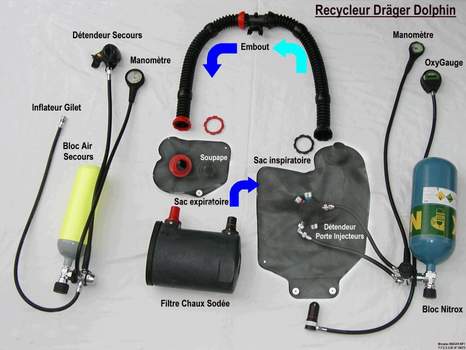 connecter un vêtement étanche. Avant la plongée, il est vital de rincer l’air présent dans l’ensemble de la boucle (recycleur et poumons) par de l’oxygène. En effet, le gaz initialement présent dans le recycleur et les poumons du plongeur est de l’air. Vous recyclez donc de l’air qui peut devenir hypoxique bien avant que vous ne ressentiez le besoin d’injecter de l’oxygène ! Certaines Marines recommandent de faire un rinçage complémentaire toutes les 30 minutes pour évacuer l’azote potentiel de la boucle. |