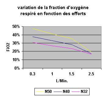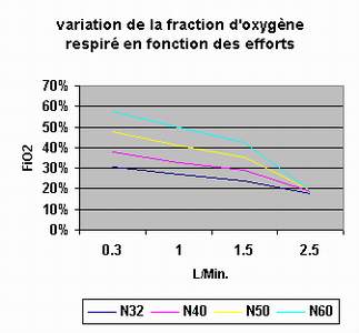 Puisque le gaz qui alimente le système est connu (Nitrox), la fraction d’oxygène inspirée par le plongeur ne peut varier qu’en fonction d’un seul paramètre : la consommation d’oxygène par le métabolisme du plongeur. Rappelons que cette valeur varie uniquement en fonction des efforts réalisés. Les données ci-dessous sont issues de tests menés en laboratoire à l’aide d’une bicyclette ergométrique : Consommation d’oxygène d’un individu: