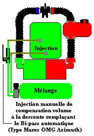 à circuit fermé : à injection manuelle C’est la technique d’injection la plus simple. Elle consiste à actionner manuellement un levier ou un bouton poussoir afin d’introduire la quantité d’oxygène souhaitée par le plongeur dès que l’inspiration se fait difficile. Difficile l’inspiration ? Précisons qu’en s’immergeant le plongeur éprouve immédiatement le besoin d’injecter du gaz dans les faux poumons qui s’écrasent sous l’effet de l’augmentation de la pression ambiante. Cette situation se renouvelle à chaque augmentation de la pression ambiante. à injection automatique L’évolution technique consiste à remplacer