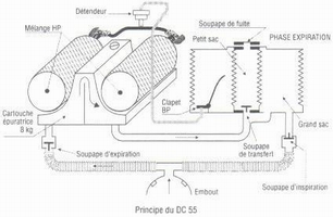 Avec ce type d’appareil, une quantité de gaz proportionnelle au volume respiratoire est injectée dans la boucle à chaque ventilation : on ne renouvelle qu’une quantité du gaz présent dans la boucle. Un avantage de cette conception apparaît immédiatement : celui de l’autonomie. De plus, la quantité de gaz renouvelée reste constante quelle que soit la profondeur. Sa valeur correspond au rapport entre le volume renouvelé divisé par le volume total des faux poumons. La valeur de ce rapport est décidée par les constructeurs. Il est appelé le taux de renouvellement (le " constant volume ratio" chez les anglo-saxons). Plus le taux de renouvellement est élevé, plus la ppO2 dans la boucle est stable. Ces mêmes constructeurs doivent faire un choix, lorsqu’ils établissent ce ratio, entre la stabilité de la ppO2 dans la boucle et l’autonomie souhaitée. Exemple : avec un taux de renouvellement de 25 %, lorsque le plongeur respire en surface avec un débit de 20 L/min, le système injecte 5 L/min de gaz frais et élimine 5 L/min de gaz vicié. A une profondeur de 30 m (4 bars), le système injecte la même proportion (¼) soit 20 L/min (puisque le plongeur respire maintenant 4 x 20 L/min, soit 80 L/min). Or, en conservant le même ratio, la quantité de molécules d’oxygène fournie en profondeur au plongeur est inévitablement beaucoup plus importante. Ce type de recycleur perd donc un peu de sa performance (autonomie) en profondeur. Nous retrouvons cette technique dans le recycleur militaire D.C.55, lui même issu du prototype D.C.52 du nom de son inventeur le pharmacien chimiste du GERS DUFAU CASANABE. C’est la technique actuellement utilisée par les recycleurs Halcyon RB 80. Le nombre 80 est en référence à la taille compacte de l’appareil (80 cubic feet correspondent environ à un bloc de 10 litres). Le fonctionnement est basé sur l’astucieuse interaction entre deux faux poumons concentriques présentés sous forme de deux soufflets : un interne et un externe. Le principe est complètement mécanique. |
