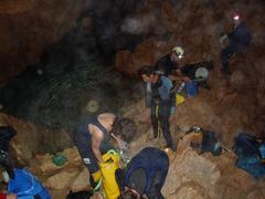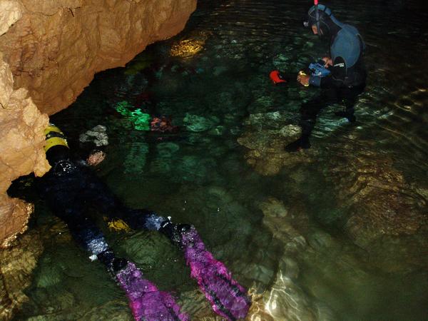 Le piégeage donne de très bons résultats en milieu troglobie où l'appât attire les espèces qui s'en nourrissent, lesquelles attirent ensuite leurs prédateurs... Ce n'est pas une méthode habituellement utilisée pour mollusques souterrains. Un piège a été déposé à Rodel aval, appâté avec de la viande de cheval (qui semble donner de bons résultats, voir notamment le manuel du projet PASCALIS, cf. biblio). Seuls des Niphargus (Niphargus cf. virei) ont été récoltés. Les prélèvements en plongée ont été effectués à la Folatière et à la Tuiède par la fine fleur de la plongée souterraine parmi les membres de la FFESS. Bien que très aléatoires, ces prélèvements sont intéressant dans la mesure où on ne possède aucune donnée sur la bathymétrie pour ces animaux. A quelles profondeurs peuvent-ils survivre ? La profondeur est-elle un obstacle à la dispersion des populations ? Où dans les rivières souterraines sont-ils les plus abondant ? Traitement des échantillons : Les échantillons prélevés en milieu aquatique sont d'abord immergés quelques jours dans l'espoir de voir remonter des individus vivants. Les individus peuvent être suivis à la trace dans le sédiment Le sable est ensuite bien séché et plongé à nouveau dans de l'eau. Le surnageant est alors versé dans un filet à mailles fines (500 microns). Les coquilles qui flottent sont ainsi collectées dans un petit volume de sédiment. Conservation des échantillons : Toutes les coquilles sont conservées en collection. Des individus récoltés vivants ont été conservés en alcool pour des études anatomiques et ou génétiques. D'autres ont été mis en aquariums dans l'espoir de les maintenir vivants et d'observer des éléments d'écologie et de biologie (comportements, ou événements comme la reproduction).