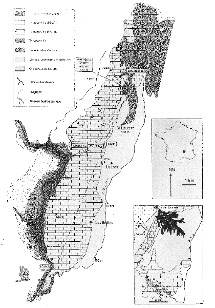 CONTEXTE TOPOGRAPHIQUE ET SRUCTURAL Le karst occidental du Coiron est constitué de calcaires jurassiques, mis en place il y a 150 millions d'années environ. Etroite bande s'étirant entre l'Escrinet et le village de Vogüé, le plateau calcaire présente un léger pendage vers l'est et est entaillé au nord par deux ruisseaux temporaires : Louyre et l'Eyrolle. L'originalité provient de la présence de coulées de basalte datées de 6 à 7 millions d'années qui recouvrent aujourd'hui les calcaires. Les eaux provenant des Coirons se perdent sous terre au contact des calcaires grâce aux nombreuses pertes des ruisseaux de Louyre et de l'Eyrolle. Après un parcours de 16 km pour un dénivelé d'environ 600 m, l'eau rejoint l'Ardèche par les Sources du Pontet à Vogüé, ce qui constitue la plus importante percée hydrologique du département. LES PRINCIPALES CAVITES Les connaissances actuelles sur ce secteur sont le fruit de quarante années de travail bénévole effectué pour l'essentiel par les membres du Spéléo Club d'Aubenas. Ces cavités comptent parmi les plus importantes du département. La Baume de Chabannes (Lussas), connue depuis le siècle dernier , est une résurgence temporaire située sur l'aval du ruisseau de Louyre. En 1974, un pompage du siphon d'entrée a permis d'explorer 800 m de galeries. La découverte, en 1966, et l'exploration de l' Aven des Blaches (St-Laurent), d'une profondeur de 100 m, avec la présence d'une rivière souterraine, marquent le début des recherches spéléologiques sur le secteur. L'entrée s'effondre en 1988, et il faut attendre 1993 pour qu'une autre entrée, la Perte du Grand Pré, soit découverte et explorée. Malheureusement, cette entrée s'effondrera, elle aussi, après que les spéléologues aient pu poursuivre l'exploration jusqu'à -130 m de profondeur. Découvert en 1972, l' Abîme Valérie (St-Laurent) est, semble t-il, un regard sur le cours souterrain de Louyre. Les explorations ont permis de découvrir 1,2 km de galeries pour 65 m de profondeur. La Grotte du Câble (Lussas) est elle aussi une résurgence temporaire mais, à la différence de la Baume de Chabannes (située juste en aval), une rivière souterraine parcourt cette cavité. L'exploration n'est possible qu'après avoir pompé le siphon d'entrée, objectif réalisé par le club en 75, 78, 83 et 95. La Grotte du Câble développe 2,1 km de galeries. L' Aven de la Combe Rajeau (St-Laurent) est la cavité la plus importante du secteur. Découverte en 1978, son exploration a permis de mettre en évidence plus de 12 km de galeries dont 4,5 km de rivière souterraine, pour une profondeur de 250 m, ce qui fait d'elle la plus profonde du département. En 1984, dans le but de connaître l'organisation des cavités entre elles, Robert Courbis effectue différentes colorations des rivières souterraines qui prouvent la relation hydrologique entre l'Aven des Blaches - la Combe Rajeau - la Beaume de Chabanne et les Sources du Pontet (Vogüé). Enfin, un inventaire spéléologique sera publié en 2001 par Thierry Marchand : « Les Gras, du Coiron à la Beaume ». |