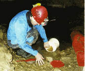 Si le dépôt est constitué de sable sec, ne pouvant contenir que des coquilles mortes, des sacs en plastique assez solides suffisent. S'il y a espoir de ramener des individus vivants permettant une étude biologique plus riche, il faut utiliser des bidons étanches et conserver un mélange de sédiment et d'eau. Dans le cas d'une sortie spéléologique ordinaire, on les disperse au fond des kits des participants tandis que, pour une visite spécifique, on se charge au maximum. Pour mémoire, un bidon de 3,5 litres plein pèse 9 à 10 kg, un de 61 de 15 à 17 et, si on en met deux, ça fait 30 à 35 kg à remonter. |
