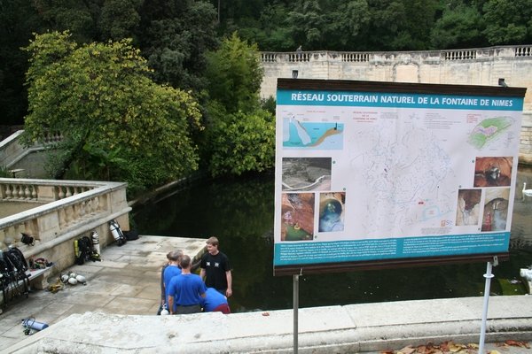 L'équipe « Plongéesout », dédiée à l'étude et l'exploration du milieu souterrain par la plongée, a organisé, à l'occasion de son assemblée générale constitutive, une rencontre internationale de plongeurs souterrains. L'objectif visait à confronter les techniques et savoir-faire développés dans divers pays pour explorer le milieu souterrain, afin de sécuriser au maximum les plongées. Les paramètres sont parfois variables d'un pays à l'autres (température de l'eau, section des galeries, clarté de l'eau, profondeur atteintes et distances parcourues). Dans cette discipline où les évolutions techniques sont très rapides, il est salutaire de s'ouvrir et d'échanger sur les progrès et options choisies par les uns et les autres. Les échanges ont porté sur l'utilisation sécurisée de recycleurs à circuit fermé. Tous les participants adoptaient une redondance en ouvert, avec une bouteille de 10l embarquée et le dépôt préalable de bouteilles de sécurité tous les 100m. Le site de la Fontaine de Nîmes a été retenu pour sa situation géographique, mais surtout pour la qualité et le suivi de l'étude de la source par les spéléologues nîmois, depuis plus de 40 ans. Des membres de l'Association Fontaine de Nîmes étaient présents pour témoigner de la richesse du site et des nombreux mystères qui demeurent à révéler. Malgré l'indisponibilité des collègues espagnols et des collègues de Côte d'Azur (qui ont opté pour des recycleurs semi-fermé redondants) 21 plongeurs et plongeuses venus depuis l'Allemagne, la Suisse, l'Italie et de plusieurs régions de France ont profité de ce rassemblement pour découvrir des machines et des techniques spécifiques.