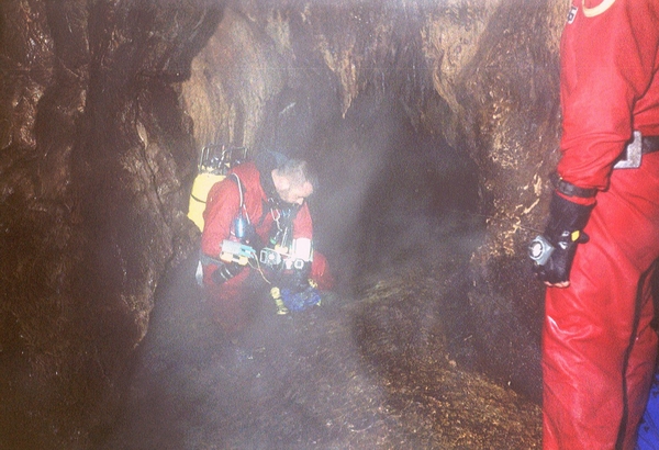 Il manquerait à vérifier d'où sort le courant qui se manifeste dans la partie active, et à trouver pourquoi les plongeurs ne le retrouvent pas dans le siphon. » Marc : « Finalement, le temps se calme et Roger et Frank partent faire une tentative à Jabokrek en fin de journée. Ils reviennent enchantés: la jonction est faite. Ils ont déroulé 45 m de plus et son sortis dans une grande salle où ils ont aperçu des chauves-souris. Pour amarrer le fil, ils avaient emporté des piquets de bois de 50 cm qu'il leur suffisait de planter dans l'important dépôt que couvre tout le fond de la galerie. Ils ont également vu plusieurs écrevisses voraces dans le siphon. Ils ont fait toute la topo. Objectifs pour le 13/8: Pour le 13/08 : - Sokolska : Laurent, Richard, Mari, Gordan + 5 spéléos du club de Pleven. - Izvora : Roger, Marc. - Medjata dupka : David, Frank. Lundi 13 août Marc : « On s'est mis en route de bonne heure vu les gros portages à réaliser. 1) « Izvora »: Roger et Marc arrivent à la vasque sans encombre par le chemin reconnu la fois précédente. Marc fait un brin de désob pendant que Roger s'équipe léger. Il se met à l'eau sans palmes vu l'étroitesse du trou. Il ressort après 5 minutes seulement. En fait, le siphon s'élargit un peu à un mètre de l'entrée et prend la forme d'une faille que l'on suit jusqu'à -3. Là, pas de chance, des blocs barrent irrémédiablement la suite. De plus, tout est instable et donc assez peu engageant. Rideau! Marc prend quelques photos de la mise à l'eau. 2) « Medjata »: La vasque a un diamètre de 4 mètres, environ. David se met à l'eau en bi-4l. Il descend rapidement à -6 dans la vasque. Ensuite, cela devient plus étroit. La suite est un laminoir en pente avec un fond de graviers. Il avance encore un peu, mais ça continue à se rétrécir et la touille le rattrape bientôt. Ici aussi: rideau ! Il se confirme que des restes de pompage sont abandonnés depuis au moins 10 ou 20 ans à proximité du siphon. David : « Frank et moi avons été laissés sur le bord de la route qui mène au siphon de la grotte de l'ours, le reste de l'équipe est parti plonger à Sokolska. La marche d'approche est de quarante minutes à travers un petit sentier chaotique puis dans l'escalade d'un couloir rocheux. L'entrée de la grotte n'est pas très grosse (1m 50 de diamètre) l'évolution se fait dans une galerie étroite sur 30 mètres, la fin du boyau se finit en toboggan puis en un ressaut d'un mètre pour déboucher au départ du siphon. Frank m'a aidé pour me passer les bouteilles et le reste du matériel. La vasque du siphon mesure 4 m de diamètre. L'eau est claire, pour l'instant je distingue au fond de l'argile. Je m'immerge le fond est à 6 m de profondeur la suite du siphon est dans un laminoir, je m'engage dans celui-ci les pieds en avant en prenant soin de bien placer mon fil. Je me faufile raclant mon bi 7l, je dois évoluer tantôt à droite tantôt à gauche pour passer au plus large du siphon, au bout de 10 mètres de progression dans le laminoir je baisse la tête pour trouver la suite. Un nuage de touille m'aveugle complètement je décide de stopper cette exploration (limite psychologique) j'amarre difficilement mon fil et récupère mon dévidoir. Le retour fut pénible surtout lors de la sortie du laminoir.La suite du siphon doit se faire par des plongeurs aguerris à ce genre d'exploration ( étroiture et touille ) je pense plus particulièrement à notre ami belge qui aurait dû plonger celui-ci et qui par faute de temps à du rentrer chez lui, c'est pour cela que je nommerais ce trou : le trou à Boubou. » - 3) « Sokolska »: C'est Laurent qui a fait la pointe en bi-9l. Il retrouve sans problème le terminus de Marc et raboute son fil. Il progresse jusqu'au bloc aperçu lors de la première plongée. Il continue sur quelques mètres. La galerie descend un peu et ensuite la galerie fait un brusque coude vers la gauche et se termine sur éboulis. Il fait quelques recherches mais la sans trouver de passage. Il rebrousse chemin et ressort. En revenant, il croit avoir entendu le bruit de ses bulles crevant dans une cloche à quelques mètres de la mise à l'eau, mais le touille l'a empêché d'aller voir. C'est le dernier espoir, sinon, c'est fini. Une ultime pointe pourrait donc être tentée, mais les chances sont minces et cela ne doit être qu'un objectifs de replis. Plongée 20 min/-17. Le développement est donc de 70 m/ -17, arrêt sur éboulis. Laurent pense que la galerie explorée ne serait en fait qu'une branche morte ce qui expliquerait l'important dépôt argileux. A revoir, si on a le temps... » Marilyn : « L'équipe qui part pour Sokolska est composée de Gordan, Richard, Mari et Laurent plus 5 porteurs. La marche d'approche est rude et chaude, mais dès que l'on arrive à l'entrée du trou, la température chute de plusieurs degrés. Pensée du jour : « Le paradoxe avec les plongeurs, c'est qu'ils mangent dans de la vaisselle sale. » Objectif pour le 14/8: Comme prévu, pointe de Frank avec photos par Richard à « Temnata ». Il y aura 11 charges à porter à l'aller et deux de plus au retour vu le matos à ressortir (relais 9l, détendeurs, canot). Plongée avec tous les porteurs à Temnata ( y compris Triphon et sauf Roger). Mardi 14 août Marc : « Tryphon et Nina nous ont rejoints. Ce sont eux qui assureront l'intendance pendant quelques jours en remplacement d'Alexeï. Départ du camp de bonne heure. Nina et Roger, après avoir déposé les autres à la grotte, vont faire des photos dans un canyon proche. Tous les autres s'équipent pour « the big one ». On se partage les nombreux sacs et c'est parti. On progresse rapidement et le siphon est atteint en 55 minutes. Tryphon et quatre des porteurs ont déclaré forfait au bord du premier lac. Ils nous attendront là car le passage en canot ne les tente vraiment pas. Il faut dire à leur décharge que, pour la plupart, ils plutôt sont mal
