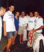 Des embouteillages nous retardent passablement tant sur le trajet aller que le retour. Finalement, après avoir chargé les affaires de David et Laurent, je gagne encore quelques heures d'embouteillages avant de retrouver Montpellier, écrasée par la Canicule vers 16 heures ». Marilyn : « Nous partons à 19h40 de Montpellier, avec un camion de location chargé jusqu'au plafond de matériel. Direction Nice, Ancône et Igoumenitsa en Grèce ». Marc : « Départ de Bruxelles à 8hr le chargement terminé. Peu de monde sur la route. Bivouac le soir, vers 21hr un peu avant Parme en Italie. Casse-croûte frugal et dodo ». Jeudi 2 août Marilyn : « 24h La pause repas se fait au-dessus de Monaco, dans une aire où un tas de gens dorment par terre. 24h10 Nous sommes à la frontière italienne. 2h Arrêt de 4h pour dormir. L'arrivée au port d'Ancône se fait à 11h45, c'est le port d'où nous devons prendre le bateau pour Igoumenitsa. Les camping-cars se rangent sur le pont Open –deck et nous faisons heureusement partie des chanceux qui se rangent sur ce pont aéré. La file interminable des semi-remorques, des voitures et des camping-cars commence enfin à avancer. Nous avons un exemple typique du “sang-froid ” italien au moment de faire les manœuvres dans le bateau. A 17h30 nous avons enfin le loisir de nous précipiter dans la piscine d'eau de mer sur le pont pour se décrasser de ces journées de trajet sous la canicule, avant de nous jeter sous des douches fraîches a souhait. Il fait chaud sur le pont des véhicules, et nous dormons plus où moins mal suivant les personnes ». Marc : « On se remet en route le lendemain vers 7hrs après un levé à l'aurore vu que Roger s'est fait déguster par les moustiques toute la nuit ; les pauvres ont du se payer une belle indigestion. On arrive à Ancône vers 11hr suites aux habituels embouteillages sur le périf de Bologne. On cherche un peu et on tombe sur Gordan venu de Split le matin très tôt. Frank arrive avec Marilyn, suivi une heure plus tard par Boubou et Fabienne. On se vide une chope et on s'en va faire pointer nos billets. Ensuite, on glande joyeusement trois bonnes heures sur le port en attente d'embarquement. On finit par monter sur le bateau à l'heure du goûter et l'ancre est levée dans les temps aux environs de 18hr ». Vendredi 3 août Marilyn : « Débarquement à 8h30 en Grèce. Nous montons directement dans la montagne et passons au point culminant : le col de Contara à1700m d'altitude. A 13h nous décidons de nous arrêter aux Météores. Ce sont de grandes falaises, avec des monastères au sommet, et des restes d'habitats troglodytiques. Nous restons un moment pour prendre des photos. A 20h, nous nous arrêtons pour dormir au bord du lac de Lithotopos, dans une aire de camping très sale, a l'image du pays ». Boubou : « Nous avons traversé le berceau de la démocratie universelle! Visiblement, ils n'ont gardé que le berceau ?! » Marc : « Débarquement à Igoumenitsa le lendemain matin à 8hr. On fait les pleins et on se lance immédiatement dans la traversée de la Grèce. Pique-nique aux « Météores » à deux pas des monastères. On termine la route décidément sans grand intérêt et on campe le soir à une vingtaine de kilomètres de la frontière ». Boubou : « Oh, Lac, L'année à peine a fini sa carrière, Samedi 4 août Marilyn : « Après le petit déjeuner, nous prenons la direction de Sofia. A 9h30, nous arrivons à la douane Grecquo-Bulgare, où toutes les formalités nous prennent beaucoup de temps : entre les lavages dans l'eau sale pour payer un droit de passage et les “petits plus ” qu'il faut verser aux douaniers, il y a aussi les gamins qui lavent les pare-brise des voitures et qui, quand on leur fait non de la tête, le font quand même du fait que les signes sont inversés chez eux. Jusqu'à Sofia, les directions sont : Sandanski, Kresna, Blagoevrad, Stanke, Dimitrov, Sofia. La recherche du passage dans la ville est épique : Gordan lit les panneaux écrits en cyrillique et Marilyn cherche sur la petite carte si les noms correspondent. Nous avons rendez-vous devant les locaux du ministère des sports avec le secrétaire Triphon, qui nous invite chez lui. Sa femme Nina parle français. Ils insistent pour que nous mangions chez eux et nous offrent l'hospitalité pour la nuit. Vers 21h, nous avons enfin des nouvelles de Richard et Laurent qui ont eut du retard avec leurs avions et dorment chez Alexeï, Jalov. » Marc : « On repart le matin à 8hrs. En approchant de la douane, nous doublons l'interminable file de camions en attente. Malgré cela, il nous faut 2 hr pour les formalités de douanes et de change ( 1 DM = 0,993 Lev ). Nous sommes à Sofia pour diner. On donne un ou deux coups de fil et nous arrivons finalement vers 15hr au siège de la fédé. C'est Triphon et un ami qui nous accueillent. Après les salutations d'usage, Tryphon nous propose d'aller directement chez lui car Alexey Jalov, notre contact en Bulgarie, est parti chercher Laurent et Richard à l'aéroport et n'est pas contactable. Nous attendrons donc des nouvelles en faisant connaissance avec Tryphon et son épouse Nina. Nous sommes invités à souper et à passer la nuit chez nos nouveaux amis. L'accueil est vraiment chaleureux et nous vidons nos premières « Pivo » en bavardant joyeusement. Alexey et les retardataires ne nous retrouverons que le lendemain car leur avion avait du retard. » Pensée du jour : « Le cyrillique, en anglais, c¹est pas facile non plus ! » Dimanche 5 août Marilyn : « Après l'arrivée des retardataires du soir précédent, et le petit déjeuner bien garni, nous prenons la direction de Vratsa, la ville proche du lieu de camp. A 10h, Frank se rend à la station de radio locale pour une interview, pendant que nous assistons à un très joli “défilé de brochettes. ” Le temps de faire les courses, nous arrivons au camp à 14h45 : il se compose d'un chalet en bois genre ca