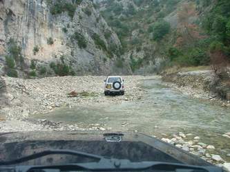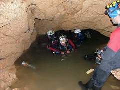Nous arrivons sur site à 9h du matin, avec deux 4x4, ceux de David et Laurent, pour franchir la rivière et arriver au plus prêt de la grotte. Les berges ayant été réaménagées, il nous faut mettre les véhicules en travers de la rivière et décharger notre matériel sur le dessus d'un talus 1,5m. Après un effort de 1h30, pour descendre notre matos de plongée dans la grotte, et un petit briefing, pour mettre au point les déposes et le run time, Yves et Laurent commencent à s'équiper.