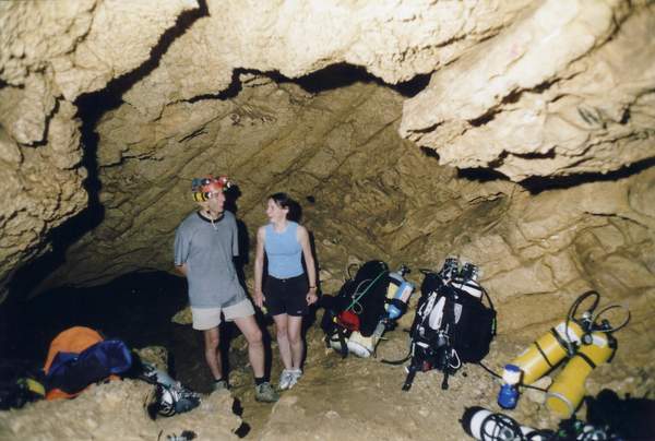 Le niveau dans la caverne était six mètres plus bas. Aussi, le siphon débutait vingt mètres plus loin que dhabitude. Nous sommes arrivés dans laprès-midi pour préparer la plongée du lendemain, en fonctionnant en équipe et en transportant les bouteilles et tout léquipement jusquà la vasque.