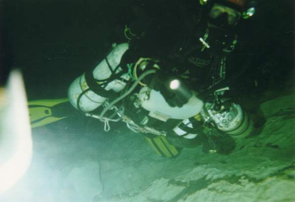 Jai déposé mon oxygène à 6 et les relais de nitrox à 30 avec un Nikonos 5. Après 26 minutes, jatteignais le point bas du siphon. Le conduit remontant après un coude sur la droite était très attirant, mais mon planning prévoyait darrêter là, aussi jai entamé le long chemin du retour.