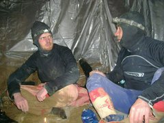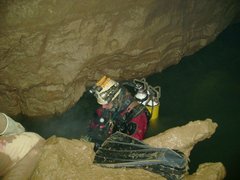 Les préparations du matériel de plongée au bord du lac n'étaient pas très idylliques, pas mal de boue. Le soit disant aval ne passe pas, mais il reste à fouiller méticuleusement le premier gros lac. Il reste notre seul espoir.