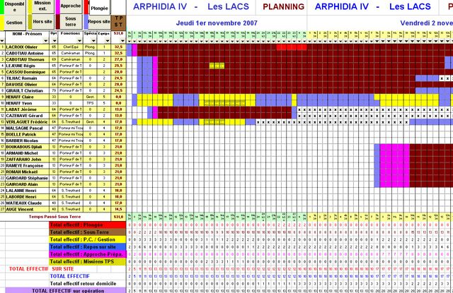Le tableau ci-dessous permet de visualiser le nombre de participants, par équipe, leurs objectifs et leur temps passé sous terre. Au total, 27 spéléos ont participés pendant ces trois jours, répartis en quatre équipes.