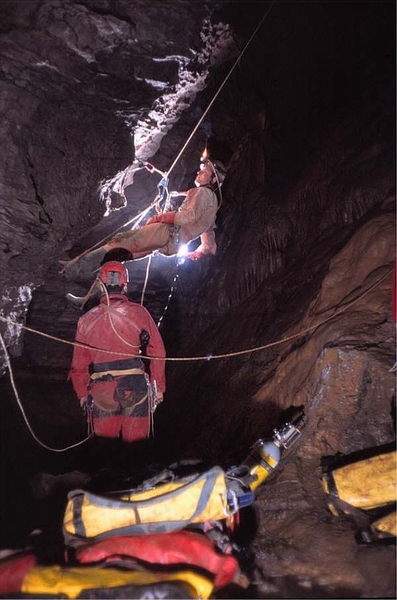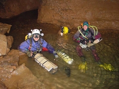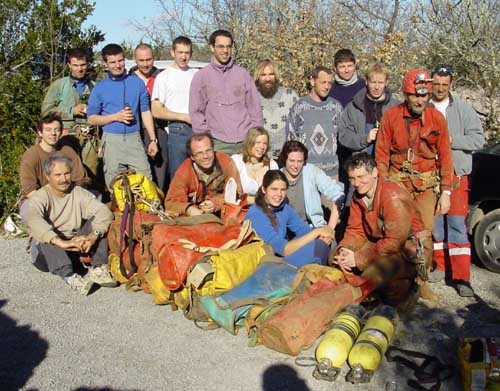 Exploration de février 2004 par Jean-Pierre Baudu. Nous avons déjà bien avancé la topographie jusqu'à –27 mètres dans le S8. Avec Frank, nous décidons de réaliser la topographie jusqu'au siphon terminal. Nous emportons 200 mètres de fil et le gaz qui devraient nous permettre de poursuivre les explorations. Le moral est au beau fixe, surtout que la fin est donnée pour être une étroiture ensablée. Nous décidons de changer devant le S10 notre configuration de bi7 litres dorsal en restructuré (latéral). Pour l'heure, nous avons 13 bouteilles (Frank et moi), une 10 litres de nitrox 45% pour rejoindre le S5, une 4 litres de nitrox 45% que nous laissons en sortie du S7, dans le S8 nous emportons 2 bouteilles pour le traverser, une 10 litres de nitrox 45%pour la zone du début avant la grande descente et une 12 litres 30% pour la zone profonde et la fin du siphon et le S9. La fin va s'effectuer avec le bi 7 litres. Frank prend une 4 litres supplémentaire en sécurité pour les 4 siphons d'entrée. Deux plongeurs nous apportent deux bouteilles chacun jusqu'au S8 (David et Damien). Le mercredi 4 février, un groupe de spéléo mené par Frank équipe la cavité et descend déjà 10 bouteilles pour la pointe. Cela nous permet de nous apercevoir que les niveaux sont hauts. La visibilité est de 2 mètres. Après de longues soirées au téléphone pour trouver des camarades pour l'acheminement du reste du matériel, les préparations du fil et des mélanges (Nitrox), nous arrivons au jour J. La cavité est reéquipée (précaution pour le matériel en place) puis les charges descendent rapidement. C'est parti pour David et Damien, puis c'est notre tour. Nous sommes pourvus de notre bi 7 litre dorsal et de deux relais de 10 litres. Les siphons s'enchaînent jusqu'à la sortie du S3. Nous franchissons une courte escalade inconfortable avec les blocs sur le dos et nous nous faisons passer les nombreux relais. Nous plongeons le S4 pour sortir dans un passage étroit encombré de spéléo-plongeurs. n ous nous marchons dessus pour enfin sortir de la trémie et porter nos blocs jusqu'à une diaclase étroite qui nous oblige à faire la chaîne. Cinq minutes de pose devant le S5 et nous passons les siphons S5, S6, S7 entrecoupés de passages plus ou moins larges… l 'ensemble est franchi avec notre relais de 4 litres, notre bi 7 litres dorsal et un de nos relais de 12 litres. Enfin le S8, pour David et Damien c'est la fin bien méritée. Une petite margelle étroite et peu confortable mais hors de l'eau leur permet de nous attendre. Nous mangeons une petite barre et c'est reparti. Nous posons notre premier relais en haut du grand puits et c'est la grande descente, superbe puits, un vrai plaisir. A notre précédent terminus, j'attache mon fil et Frank topographie. Après le point bas, la remontée est rapide. Mon détendeur (détendeur en prêt) est en légère surpression, je consomme plus que d'habitude mais sans m'inquiéter. Le post-siphon s'avère moins confortable que nous l'avions espéré. Nous nous déplaçons à quatre pattes, les blocs sur le dos en tirant une 12 litres, c'est dur !!! Je suis moins grand que Frank et je passe un peu mieux. Frank propose que nous abandonnions notre relais. A la sortie du S9, le bruit caractéristique d'une cascade se fait entendre. Superbe, j'adore les beaux actifs. Frank enchaîne l'escalade et cette fois sa grande taille lui est favorable. Pour moi, c'est plus difficile. Je laisse beaucoup d'énergie dans ce passage. Nous atteignons le dernier siphon, le S10. Frank me propose de passer devant, il fera la topographie. Je transforme mon brelage et je positionne mes bouteilles en restructuré (relais). Frank reste dans la même configuration. J'attache mon fil et déroule. La morphologie change, la galerie devient plus sinueuse. Après un virage à gauche et un départ vu sur la droite, je rejoins le point bas à –18 mètres. Le sol est recouvert d'une fine pellicule de sable. L'étroiture terminale de nos prédécesseurs est infranchissable. Je reviens dans une touille terrible en notant quelques points topographiques. Une tension brusque sur le fil me le fait perdre. Je le cherche avec les bras, sans succès. Puis j'avance d'un mètre et refais la même opération pour enfin sentir mon fil. Je retrouve Frank dans la vasque. Nous avons vu un départ à droite. Nous replongeons et sortons du siphon. L'exondé est étroit et Frank me laisse plonger le S11'. e n fait, je retrouve la liaison observée au point bas du S10, mais à droite je ressors encore dans un nouvel exondé. j 'entends la cascade au loin. Je suis de retour sur mes palmes. Une escalade à gauche permet de remonter de 10 mètres. Je retrouve Frank et partageons avec les Niphargus un peu de gruyère et de jambon. C'est l'heure du retour. Je récupère devant le S8 ma 12 litres mal fermée (prêtée) et toujours ce détendeur en surpression. Dans les premières dizaines de mètres, le détendeur se met en débit constant. Nous avons notre bi 7 litres peu entamé donc avec une réserve importante d'air. C'est un cas d'école, une bouteille que je ne connais pas (robinet un peu dur), un détendeur tout neuf (défaut sur un écrou de réglage du deuxième étage) et nous nous retrouvons dans la situation où la bouteille déjà entamée au départ du S8 (au retour) se vide rapidement. De plus, je me retrouve avec une bouteille trop légère qui me déséquilibre. Je ne suis pas réellement en danger (réserve d'air importante) mais à long terme, le stress et la fatigue aidant cette situation peut devenir préoccupante. Nous retrouvons David et Damien frigorifiés. i ls ne nous laissent pas le temps de souffler et nous revoilà, enchaînant les derniers siphons. Merci à tous nos camarades qui nous ont aidés… |
