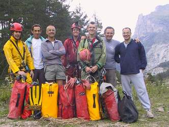 | Un peu d'Histoire La première plongée dans le puits des Bans date de 1946. Jean Marty réalise un exploit pour l'époque, au sortir de la guerre, trouver un scaphandre "Georges Comheines" modifié et le monter sur le Dévoluy. Il parcourra une centaine de mètres dans la suite exondée. Mais il s'agissait alors du siphon à 20 m de l'entrée. Après un difficile pompage et quelques travaux pour faire descendre le seuil aval, réalisés par J. Marty et A. Bourgin en 1948, le siphon Marty laissera définitivement place à une voûte mouillante. Ils atteindront alors la cote -155 m, arrêtés par un niveau d'eau relativement haut. En 1960, le GSPSIF, en collaboration avec le SC de Gap, reprend les explorations mais se confronte à un siphon à la cote -207 m. Souhaitant la participation de toute l'équipe à l'exploration, le groupe choisira de pomper le siphon plutôt que de le plonger. Le franchissement du siphon 1 sera réalisé en 1964, après trois jours de pompage continu. La suite, une galerie chaotique et exondée sur 311 m, permet l'accès au siphon 2 à la cote d'étiage de – 217 m. En 1966, la même équipe tente, en vain, de pomper le siphon 2 qui ne montrera aucune modification de niveau. En 1970, avec la même équipe, deux plongeurs varois : M. Lopez et A. Matéoli, sont invités à reconnaître le siphon 2. Ils atteindront la profondeur de 12 m avec visibilité jusqu'à 15-20m. Le siphon se poursuit sans espoir d'éviter ce verrou liquide. Il faudra attendre 1981 pour que le siphon 2 soit replongé. C'est F. Poggia qui mouillera les palmes jusqu'à 55 m (cote topo).