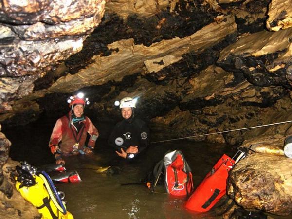 Un coup de chapeau à Christophe PASCAL, mon plongeur de soutien, qui a assuré le portage des grosses charges entre les siphons pendant que je récupérais.