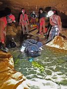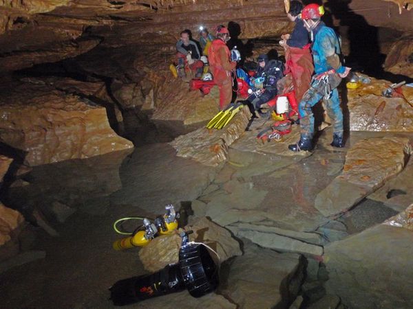 pour continuer à dérouler mais il est bloqué par un noeud bien serré. Retour rapide vers la zone des 400 mètres. Pourtant, malgré le scooter, je sens monter l'essoufflement : le coup de chaud, le stress, l'irrépressible envie d'arracher le masque et l'embout pour mieux ventiler. Mais le passage sur circuit ouvert n'est pas sans conséquence. Pas de retour possible sur la boucle dans les conditions présentes. Je contrôle l'ensemble des paramètres, le PPO2 est bonne, mon diluant est très optimiste avec 35% de He2. Je purge ma boucle avec un bol de diluant frais. Ça va mieux, mais c'est de courte durée. L'hyperventilation reprend. Cette fois-ci, je stoppe mon palmage, je ralentis le scooter, je mets de l'air dans la combinaison et je vais raser les plafonds pour diminuer la profondeur. Les symptômes disparaissent. Arrivé à 400 mètres, tout va bien. Nouveau contrôle complet : RAS. Je démarre le relevé. Les visée sont longues d'un méandre à l'autre. Je suis vite aux 200 mètres. Rangement, récupération de tout le matériel et retour surface avec quelques paliers qui passeront par un retour à la palme pépère. La plongée aura finalement durée 2 heures au lieu des 3 prévues. Tout le monde est déjà de retour de quelques pérégrinations dans d'infâmes galeries boueuses autour du S2. Je reconditionne le matériel en l'enlevant et les kits partent dès qu'ils sont pleins. Le retour est calme. Concentré sur chaque pas, peu de mots s'échangent. Mais une fois dehors avec une bonne bière fraiche, les langues redeviennent loquaces. Et que dire des grillades et spécialités de chacun... Porteurs : |