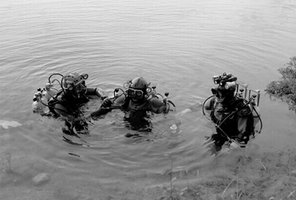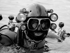 Départ dans l'eau aux environs de midi. A –12m, dépôt du mono oxygène et passage à l'air. Grâce à l'aide de Jean-Michel, la négociation de l'étroiture se fait sans trop de problème, avec le quadri sur le dos. Repassage au surox 45% à –21m. Courant sensible, mais progression relativement rapide jusqu'au haut du puits à –30. Montre réglée sur le temps zéro et départ sur le dorsal. Au début de la descente (-45m) passage sur le 50% He et progression jusqu'à –85m où j'utilise le mélange fond (70%He). Je suis la cordelette fluo (récente car posée l'année passée par Cyrille) et atteins 100m puis 120m au cours d'une descente moyennement rapide car ralentie par le courant et les ressauts successifs. A –128m, terminus du fil. Mousquetonnage rapide puis la descente continue.