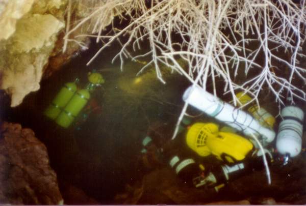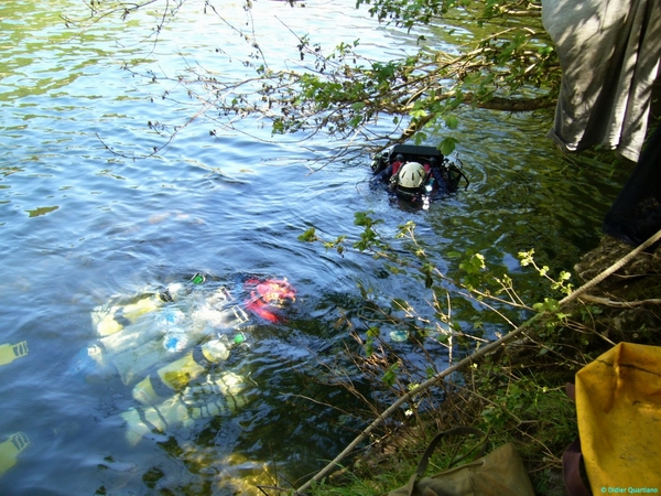 | Le rendez-vous avait été pris à 9h00 du matin pour descendre le matériel par le téléphérique du Camping des Templiers et il aura fallu deux voyages pour tout acheminer au camping où il fut chargé sur quatre canoës. Après une remontée épique de l'Ardèche (canoë qui se remplit d'eau, le chien qui tombe à l'eau et se retrouve emporté par le courant bref tout le monde trempé jusqu'aux oreilles …) on arrive enfin au bord de la source. Le temps de préparer le matériel, de casser une petite graine et c'est l'heure de se mettre à l'eau. Il est 14H40 quand nous disparaissons dans la source, la visibilité est médiocre, l'eau un peu laiteuse due aux pluies de la semaine. Il nous faudra un peu moins de 90 min pour émerger de l'autre côté du siphon, vraiment magnifique, d'un blanc que je n'avais vu que dans les carrières de craie de Beauvais, superbement découpé. En sortant la tête de l'eau, je suis surpris de voir Sylvain avec l'embout en bouche alors qu'il est là depuis plus de 5 minutes. Mais, après quelques respirations, je comprends pourquoi, l'inter siphon est chargé en CO2 et l'on peine à reprendre son souffle. Qu'a cela ne tienne, on n'est pas venu ici pour faire demi-tour sans combattre... Après m'être déséquipé, je me saisis d'une bouteille de surox de Sylvain et attaque le premier ressaut. Derrière, un plan d'eau est entièrement bouché par des blocs d'effondrement. La progression étant rendue difficile par la taille de la bouteille et le sol accidenté, la décision est prise de rebrousser chemin sans finir de chercher la suite derrière le deuxième ressaut. Le départ étant bien touillé par les sédiments soulevés pendant la séance « post siphon » ce n'est qu'après une vingtaine de mètres que nous avons pu « enfourcher » nos fidèles destriers. Arrivés sous la « cloche des Suisses » nous repartons de plus belle, pour nous retrouver quelques minutes plus tard sous la « cloche des Suisses », tiens, je ne me souviens pas d'avoir fait demi-tour. Bon nous voilà repartis une deuxième fois en faisant encore plus attention et après quelques minutes nous revoilà sous la « cloche des Suisses ». Bon là c'est sûr on tourne en rond… (C'est là qu'on apprécie vraiment le recycleur !!!) Demi tour et l'on repart pour la 3e fois. Arrivés en tête de puits, je comprends enfin : il y a 2 galeries qui partent d'ici pour se rejoindre juste avant la cloche, et le fil en place n'ayant plus d'étiquette, l'erreur était évidente. Enfin nous voilà dans la bonne direction et après nos paliers nous sortons au bout de 100 minutes. L'heure étant tardive, c'est tout équipés et au scooter que l'on descend l'Ardèche jusqu'au camping suivis par l‘équipe de soutien avec les canoës. Il est fort tard quand tout le matériel est de nouveau dans les voitures et que nous quittons à regret cet endroit magnifique. Toute l'équipe tient à remercier les propriétaires du Camping des Templiers pour leur gentillesse et leur aide malgré une heure de retour fort tardive.