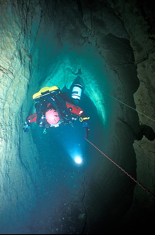 Nous avons eu une surprise formidable ! La galerie nous amenait au sommet d'un puits incroyable. Tout était noyé, aucune possibilité de trouver de poche d'air, on arrivait là, au dessus d'un trou presque circulaire de deux mètres de diamètre et tout se terminait là, sinon faire un retour, ou alors descendre dans ce trou inconnu. Mickey et moi n'avions aucune angoisse, mais beaucoup d'émotion en découvrant cette configuration qui nous permettrait d'aller voir plus loin ! Ici, c'était plus propre, la glaise se trouvait quelques dizaines de mètres derrière nous. Ce trou, ce puits, nous intriguait et nous avons palmé un peu au-dessus pour voir. Il fallait que l'on se dépêche. Le signe « tout va bien » puis le pouce vers le bas pour se dire « on y va ?? » nouveau signe « tout va bien » et c'est parti, pas de temps à perdre !! Réellement j'en garde un souvenir inoubliable. Nous avons commencé notre descente, tête en bas, Mickey devant moi j'avais une vision superbe avec la lumière de son phare plus celle du mien. C'était vraiment très beau. Il n'y avait plus de glaise, mais de la roche colorée de bleu, de vert, un peu de jaune et d'autres nuances de couleurs. Ceci donnait à l'eau cette couleur un peu bleutée cristalline. Tout en descendant je regardais ce magnifique spectacle en me faisant quelques réflexions. Déjà nous étions à 30 mètres de profondeur et ça continuait. Je me disais que ce puit, pour avoir une forme presque circulaire comme celle-ci avait du mettre des siècles pour ce former. Surtout qu'il était totalement vertical et c'est très impressionnant de descendre à la verticale !! Pendant des milliers d'années, les crues violentes qui devaient sévir en cet endroit on du faire remonter des milliards de m 3 d'eau en charriant des roches et des galets. C'est ce qui avait du donner cette forme à ce puit au fil du temps. Phénomène d'érosion !!
