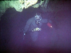 En attendant, c'était génial, dans cette eau très pure je découvrais un monde mystérieux et magnifique. Nous avions du parcourir une cinquantaine de mètre en distance, profondeur 20 mètres. Plus loin la galerie restait de même dimension : 1,50 mètre en hauteur, mais soudain elle pris des proportions d'au moins 5 mètres en largeur, alors que sa pente se faisait plus douce. Depuis le départ, cette galerie nous obligeait à faire, entre autre, un parcours sinueux,
