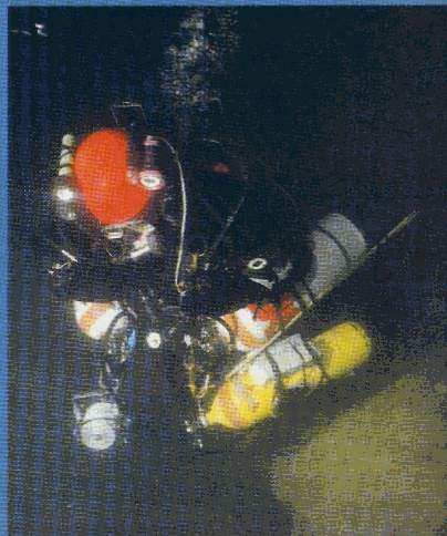 Début 1996, nous commençons par une plongée de reconnaissance dans la zone des -115 m, pour réaliser que l'équipement de nos prédécesseurs avait fini par lâche. Nous avons donc rééquipé méticuleusement cette portion en quatre plongées, le puits étant déjà muni d'une bonne corde de montagne.
