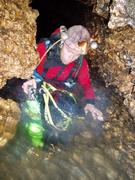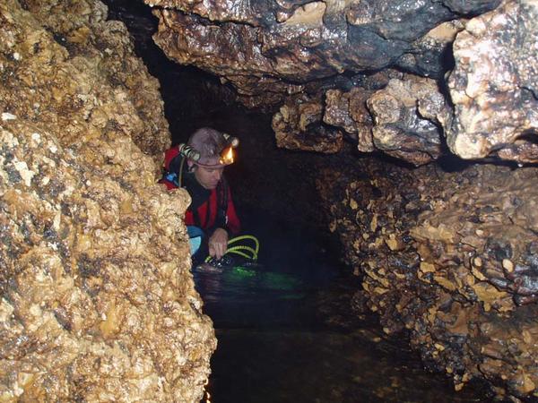 L'ambiance y est assez austère. Eau laiteuse (on aurait presque l'impression de s immerger dans un bassin de décantation), roche aux aspérités torturées, section indéfinissable, pas de morphologie distincte. Il faudra plusieurs essais pour trouver le bon fil (nos prédécesseurs ont du en découdre aussi, vu le nombre de ramifications et de culs-de fil), puis raccorder le dévidoir à un terminus de fil déchiqueté, pour remonter dans le conduit salvateur.