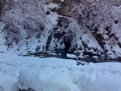 After 2 visits to this cave last year and several aborted trips in 2007 due to high water JV finally managed to arrange a trip during good conditions. The main difficulty with this cave is the water temperature which remains at 5 – 6 Celsius Year round. The current end of the cave was a boulder blockage encountered by JJ Bolanz at -55m, 250m into Sump2. The cave does not descend to -70m as described in the Cave diving guide to Eastern France. 17/11/07 JV installed a small habitat at -6m in S2. This was belayed to an Acro which was brought for this purpose and jammed across the rift at -7m. Various bailout cylinders were installed in S2. The diver had a lot of problems with demand valves freezing and free flowing as the temperature outside the cave was -6C and most seemed to contain small amounts of water which froze. As a result cylinders for the push the next day were ferried through S1 and stored underwater to prevent further freezing. 18/11/07 The diver made an uneventful trip through S1 and kitted up. Descending the Rift, the habitat was checked and one stage was deposited at the bottom of the shaft at -40m. The line is broken here deliberately by local divers to discourage further penetration. The continuation can be found on the floor at -45m by following the left wall down and proceeding 10m forwards. At this point, clear water is encountered, indicating that this major passage is not the main source of the slightly murkier water found in the shaft and resurging from the entrance. It is also possible to turn right at the bottom of the shaft, where breakdown is quickly encountered. This looks passable for a side mounted diver, but remains unexplored. Continuing on the main line, a squeeze down through boulders is encountered within 50m (This is reported passable with back mounts by Andre Gloor) and 150m later 10 mins after leaving the shaft) the terminus of JJ Bolanz is reached. There are 3 possible ways on through boulders: