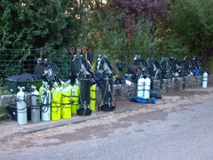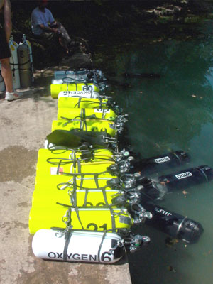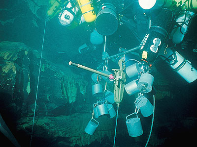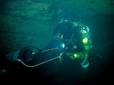 NDLR : Nous nous souvenons qu'en août 2001 Michael Waldbrenner, Reinhard Buchaly et leur équipe ont battu le record de pénétration dans les galeries noyées du Coly souterrain en parcourant une distance de 5000 m (Voir SD n° 159 p. 41-48). Un an après, les voilà qui récidivent et améliorent leur propre record en rajoutant 675 m à ce fabuleux siphon. La campagne de plongée s'est étalée du 17 au 24 août et un compte rendu circonstancié de ces journées vient de paraître sur le site Internet de l'EKPP que l'on consultera avec profit en tapant : http://www.ekpp.de/projects/doux02/history.html Nous remercions bien sincèrement les auteurs pour l'autorisation de publication de cette exceptionnelle aventure humaine qui concerne au plus haut point notre Périgord spéléologique, et plus particulièrement notre compatriote Hervé Deschamps avec qui nous avons dû échanger plusieurs courriers à propos des traductions. Aperçu de la semaine (traduction Alain Beverlain) Samedi 17 août : Après un voyage insipide de 12 heures par la route (avec un arrêt de 2 heures pour dormir), j'arrive au village de Coly à 10 h 30. Dans le parc où nous avons réservé trois bungalows pour la semaine, un certain nombre des membres de l'équipe sont déjà arrivés. Tout d'abord, Reinhard, Michael et Hervé doivent faire une visite de courtoisie au propriétaire. Le groupe attend leur retour. Enfin, une voiture arrive et les visages radieux parlent d'eux-mêmes : nous avons le feu vert ! A midi, nous pouvons commencer à décharger les véhicules et les plongeurs de soutien peuvent amener les premiers équipements dans la grotte en commençant par les deux bouteilles de sécurité, l'une à 100 mètres et l'autre à 200 mètres de l'entrée. A présent, l'entraînement paie : se déplacer en scooter avec 7 blocs n'est plus un problème ! J Très rapidement, les 30 bouteilles de décompression de Reinhard et Michael se retrouvent dans la grotte, de même que d'autres éléments du matériel. Nous regagnons les bungalows et commençons à préparer le dîner. Celui-ci est suivi du briefing : un point sur la journée. Tout le monde se dirige ensuite vers les chambres à coucher afin de se reposer convenablement ; une nuit blanche, c'est assez pour moi ! Dimanche 18 août : Après un petit-déjeuner constitué de pains au chocolat, nous nous rendons tous au briefing à 8 h. L'objectif du jour est d'installer deux cordes dans le puits, de fixer dessus et aux bonnes profondeurs les blocs de déco de Michael et Reinhard et de monter les habitats. Nous vérifions si nous pouvons utiliser les pitons de l'année dernière pour fixer les habitats à la bonne profondeur. Quatre pitons doivent être remplacés, il faut donc employer le marteau. Des 4 équipiers (Jiles, Ian, Tom et moi-même), seul Tom a déjà installé des pitons auparavant : nous avons donc une longue plongée qui nous attend. Après un petit cours de Reinhard sur la façon d'installer les pitons, nous nous mettons à l'eau avec deux relais chacun. Le premier piton se brise immédiatement dès qu'il est vissé. Après 88 minutes, ils sont tous en place ; Michael et Reinhard peuvent alors installer le premier habitat. Mais au moment où ils décident de revenir, Reinhard fait un dernier contrôle de l'habitat de Michael (flottabilité positive de 800 kg) et nous entendons un bruit violent. Un des anciens pitons s'est brisé et le choc a aussi cassé la corde qui maintenait l'habitat en place. Un petit contretemps… Pas de problème dit Reinhard, on s'en occupera demain. Pendant ce temps, Paolo a filmé l'activité dans le puits : l'installation des pitons, des cordes et des bouteilles de décompression. Lundi 19 août : Après un rapide petit-déjeuner, Reinhard et Michael font le briefing. On parle des activités du jour et elles sont réparties parmi les membres de l'équipe. Je ne plongerai pas aujourd'hui étant donné que je me suis porté volontaire comme responsable de surface, dont la responsabilité est de veiller à ce que les tâches soient accomplies et de noter qui est dans l'eau et pour combien de temps. Jiles et Wido ont demandé à s'occuper de la fixation des nouveaux pitons. Mais ils doivent d'abord ramener l'habitat du fond du puits : suite à l'incident de la veille, l'habitat de Michael avait une fuite et a perdu tout son gaz pendant la nuit. Maintenant, la règle selon laquelle personne n'entre dans la grotte sans au moins un Trimix 21/35 sur le dos devient évidente : essayez de récupérer un habitat à 42 mètres au Nitrox 32 ! Le reste du groupe poursuit son travail et amène les bouteilles pour les plongeurs de soutien profonds. Pour deux équipes au recycleur, le plan est d'installer quatre relais et quatre scooters entre 1,5 km et 2 km de l'entrée avant la plongée de pointe. Cela permettra à Reinhard et Michael de se déplacer plus vite avec les scooters dans la première partie de manière à pousser plus avant leur exploration. En fin de journée, les deux habitats sont montés par Michael et Reinhard et, comme chaque jour, le briefing a lieu après le dîner. Les plongeurs de soutien profonds répondent par l'affirmative à la question de savoir s'ils souhaitent un jour supplémentaire pour terminer leurs préparations. Cela ne constitue pas un problème ; c'était prévu dans le planning. Mardi 20 août : Comme cela est maintenant une habitude, petit-déjeuner aux petits pains au chocolat. Après le petit-déjeuner, le briefing. Aujourd'hui, les dernières mises en place pour le soutien profond doivent se faire, ainsi que les dernières vérifications pour la plongée de Michael et Reinhard. Nous mettons dix scooters Magnum à l'eau pour la pointe et les amenons au fond du puits pour que les équipes de soutien profondes n'aient plus qu'à les emmener. Ainsi, la première équipe de soutien profonde en circuit ouvert part installer deux dévidoirs et deux relais. En fin de journée, il reste du temps po