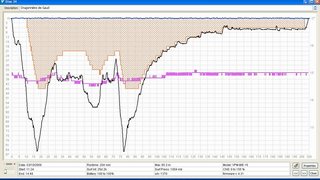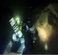 Décompression calculée avec des ordinateurs multi-gaz à PPO2 constante embarqués fonctionnant sur l'algorithme VPM(1 par plongeur) + tables de secours calculées avec VPM. Conditions : Température de l'eau : 15°C 4) we des 5 et 6 avril 2008 Le week-end dernier, nous avons poursuivi les investigations dans la Dragonnière de Gaud. Le niveau de l'Ardèche était très bas (en-dessous du 0 de la station de météo France à Vallon Pont d'Arc), ce qui facilite grandement le transport du matériel, chaque fois plus conséquent. Nous avons tiré une corde en travers de la rivière afin de constituer un guide, sur lequel se déhaler depuis la barque, et installé une échelle de spéléo pour monter le redan au-dessus du débarcadère en rive gauche. La visibilité était meilleure que lors de la dernière plongée (5 à 6m environ) Deux plongeurs en recycleur et au trimix ont poursuivi l'exploration de la cavité durant 260m. Le point terminal atteint se situe à 680m de l'entrée du siphon, à –37m. Un plongeur en tête équipait, le second suivait en filmant. Malheureusement, les conditions particulières dans la cavité (ampleur des galeries, obscurité des parois, visibilité médiocre) n'ont pas permis de réaliser des images valables. Arrêt sur durée d'immersion convenue. Récit succinct : « Tout le matériel avait été acheminé la veille jusqu'au siphon (scooter, recycleurs, bouteilles embarquées) et la ligne de décompression de sécurité était installée jusqu'à –60. Les gelées matinales tempérèrent sensiblement nos ardeurs, et c'est seulement à 10h20 que les deux plongeurs franchissent l'interface, sérieusement soutenus par toute l'équipe. Dès le départ, Eric fait des essais vidéo. Comme nous disposons de 20 minutes d'éclairage pour les prises de vues, il est convenu de ne pas insister si les images subaquatiques ne rendent pas. Afin d'économiser les batteries pour la galerie exondée si d'aventure nos émergions de l'autre côté du siphon. Un signe de dépit (c'est mal engagé pour la vidéo), combiné à un autre d'encouragement (à avancer) donne le départ. Le reéquipement du fil d'Ariane est bénéfique, et nous descendons « allégro », malgré nos scooters alourdis par le matériel vidéo. En 11 minutes, nous atteignons en le terminus de la partie topographiée (325m ;-83). Il est convenu que je poursuive la topographie, pendant qu'Eric tente à nouveau des prises de vue. Là, stupeur ! Je cherche mon compas (tout neuf car j'ai récemment perdu mon fidèle compas e relèvement dans une source pyrénéenne), accroché à un mousqueton sur la bretelle de droite, en vain. J'enrage, tant pour l'impossibilité de lever la topographie que pour le prix de l'instrument. J'en fait part à Eric par ardoise interposée. Tant pis, autant avancer, nous la ferons la prochaine fois. Le point bas (360m ;-89) est atteint en 15 minutes. L'ordinateur affiche 50 minutes de paliers. Nous amorçons la remontée en longeant d'abord un talus d'argile avant que le puits se verticalise, à partir de –75. La goulotte est striée de profondes cannelures verticales attestant d'un fonctionnement à l'air libre. Rapidement, nous retrouvons le dévidoir déposé à –54 (420m)lors de la dernière plongée. Nous entamons l'équipement de cette puissante verticale subaquatique (le puits « Messine…hein »), rythmée par les premiers paliers de décompression. Les points d'amarrage se font rare, il faut les guetter longtemps à l'avance. Les parois sont tapissées d'argile et de limons volatiles. Chaque pose d'amarrage génère un nuage d'eau trouble. Sous les surplombs, on remarque des espèces de formations limoneuses verticales, à l'allure d'algues souples, qui se délitent et s'effritent à la moindre turbulence. Nous remontons ainsi jusqu'à – 27, en vue du plafond. La suite n'est plus vers le haut, nous filons à l'horizontale en longeant une paroi verticale (rive gauche), sans vue sur le fond du puits. A 480m, le sol apparaît. C'est une vaste galerie de 5m de large pour 6 de haut, toujours tapissée d'argile (c'est une constante de la cavité). A 498m (-30), les parois se resserrent(4 x 4m), un chaos occupe le centre du conduit et deux options se présentent. Une galerie plus modeste, plus large que haute (4 x 2m) dans le prolongement (210°), ou une lucarne (3 x 3m) en hauteur en rive gauche. Le temps de raccorder un nouveau dévidoir, Eric s'assure que les deux itinéraires se rejoignent illico. Nous optons pour le bas, le plus large, qui nous ramène rapidement à –40, avec un point bas ponctuel à –42. Des Isopodes particuliers : le Spheromides Raimondi, occupent également cette partie de la cavité (la galerie « bienvenue chez les cht'…ouilles »). Nous en avons observé partout dans le siphon. La galerie se restreint ponctuellement à –42, à la faveur d'une échancrure verticale, puis reprend de confortables dimensions (de 4 à 6m de large pour 4 à 3m de haut). Vers 560m, on passe un thermocline dont nous n'avons pu évaluer l'amplitude, faute de demeurer suffisamment longtemps sur site. Il y a certainement une arrivée d'eau dans ce secteur, plus claire qui plus est. Un joli redan vertical ramène à –35, avant de plonger à –38. Nous stoppons une heure après le départ, arrivés au terme du second dévidoir, à 680m de l'entrée(-37). Nous venons d'explorer 260m de galeries noyées globalement orientées sud-ouest. Pris dans un nuage d'eau trouble (particules soulevées lors de la réalisation de l'amarrage terminal), nous rebroussons la palme la main sur le fil, l'autre tractant le propulseur, devenu inutilisable dans ces conditions. Pour peu de temps heureusement, mais pareille mésaventure se produira à nouveau au point pas de –42, dans lequel les eaux chargées (lors de notre passage à l'aller) semblent s'être concentrées. Il ne doit pas y avoir beaucoup de courant dans la cavité, ces temps-ci. Les ordinateurs annoncent alors 7