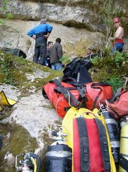 Progression au scooter Submerge UV 18, sur lesquels étaient montés le caisson vidéo + éclairage pour l'un et de l'éclairage pour l'autre. Décompression calculée avec des ordinateurs multi-gaz à PPO2 constante embarqués fonctionnant sur l'algorithme VPM(1 par plongeur) + tables de secours calculées avec VPM. Vêtements étanches en néoprène 2mm et 4mm pré-comprimé. Plongées de 240 et 271 minutes. Conditions : Température de l'eau : 15°C Camp 2-4/10/2009 Ce premier we d'octobre a été mis à profit pour poursuivre l'étude et l'exploration de la Dragonnière de Gaud (commune de Labastide de Virac), dans les somptueuses Gorges de l'Ardèche. L'étiage exceptionnel a réduit la rivière à un « pissadou de chagrin », ce qui facilite les traversées et un petit peu le portage. Le vendredi après-midi, nous nous retrouvons à 14 heures à la barrière de la piste, avec Judicael, Mehdi et Emerick. Après avoir déchargé les véhicules, nous embrayons illico sur l'équipement des passages à sécuriser, notamment Judicaël (franchissement de la rivière, redan extérieur, ressaut + vire dans la caverne) et le portage de tout le matériel. Eric et Arthur arrivent pour le goûter, et à 18 heures, Emerick et Mehdi s'immergent pour installer les bouteilles de décompression de sécurité à –6, -18 et –30. En soirée, Jean-Pierre et Catherine nous rejoignent. La nuit est sublime, lune presque pleine, éclairages rasants sur les hautes falaises, pas un nuage, concert de craquements de bois défoncés par les hordes de sangliers coutumières des lieux. Nous avons convenu d'un premier rendez-vous de contact 3h30 après le départ, puis un autre chaque 30 minute ensuite. Le profil ascendant nous laisse espérer une poursuite de la remontée, et pourquoi pas, un franchissement… L'espoir, les fantasmes, le disputent aux hypothèses plus raisonnées. Nous nous immergeons à 11 heures. Eric a monté son caisson vidéo + éclairages sur le scooter. La veille, j'ai procédé à divers test afin de m'assurer que le scooter ne perturbe pas le compas de relèvement. En effet, il faut le tenir éloigné de 40cm au moins pour éviter les perturbations magnétiques. Nous évoluons dans l'eau troublée jusqu'à la limite des plongées précédentes. Passé le rétrécissement de –65, l'horizon se révèle. La visibilité est exceptionnelle pour la cavité, que nous avions jusqu'alors parcourue dans un brouillard. Avec 8m environ, l'intégralité de la section est visible. Nous nous autorisons quelques distances, ponctuelles, avec le fil d'Ariane afin d'optimiser les trajectoires au scooter et limiter la turbidité près du fil, lors du retour. Et aussi parce que c'est fichtrement bon ces « rides » hypogées. Au terminus topo (325m;-82), j'attaque le relevé. Le carnet, fixé ouvert sur le corps du scooter, libère une main tout en offrant un support bienvenu. Le compas, solidarisé du poignet par une dragonne, ne risque plus de jouer les filles de l'air. Nous atteignons le point bas (-87) 18 minutes après le départ. Allumage des feux, et amorce de la remontée, dans une jolie galerie d'abord, puis une impressionnante fracture verticale, haute de 67m. Eric filme, les visées topographiques alternent avec les premiers paliers de décompression. Je dépose une bouteille de 20l en sécurité, pour un éventuel passage retour de la galerie profonde en circuit ouvert. Nous regardons de plus près le talus afin de réduire la profondeur du point haut, en tête du puits. Rien à faire, il faut passer à 30m, une sorte de col ponctuel. Cela fait 30 minutes que nous avons quitté la surface. Nous poursuivons de la sorte notre tandem vidéo-topographique, dans la sinuosité modérée du conduit. Si la visibilité s'est considérablement améliorée depuis les explorations précédentes, le conduit est tout autant intégralement tapissé d'argile. Les quelques bulles expirées décrochent des rideaux d'argile, qu'une palme effleure une paroi, qu'une visée impose un appui au sol, l'eau s'opacifie immanquablement. La prise de relevé est un tantinet acrobatique, j'essaie de limiter au maximum les contacts avec les parois. Mais la majorité des amarrages sont au sol, à défaut d'autres possibilités de fixation. A 560m du départ de la partie noyée, nous retrouvons le thermocline observé la fois précédente. L'eau plus fraîche surmonte celle, plus chaude (15°C) du siphon. Lors de l'exploration précédente, alors que l'eau du siphon était moins claire, la couche supérieure était plus limpide. Aujourd'hui, c'est le contraire. La tranche d'eau superficielle est sale, grise. Elle s'étale sur une trentaine de mètres, puis disparaît. Eric passe devant, comme convenu, pour prendre quelques images des relevés topos, faire quelques prises de vues avec un sujet en progression frontale. Nous ne sommes plus très loin du précédent terminus, matérialisé par le dévidoir abandonné la fois précédente, dans un nuage de touille. J'avance au scooter en finalisant une prise de cap, un tantinet ébloui par les phares d'Eric qui s'est décalé en rive gauche. Ce faisant, l'argile flue vers le sol, masquant la partie inférieure de la galerie. Je cherche des yeux le fil d'Ariane, en quête de la prochaine station topographique, sans arriver à le localiser. Surtout pas dans la purée qui recouvre à présent le sol. Alors que j'envisage de dépasser le nuage, j'entends les invectives orales d'Eric qui m'indique, force gestes à l'appui, que le dévidoir laissé en avril 2008 est là, au milieu des volutes opaques. En effet, j'aperçois, l'espace d'un instant, la gaine orangée de la poignée. Piquant illico sur ce bobineau, qui symbolise le point ultime de la précédente exploration, je l'attrape à tâtons. Nous avions convenu de dérouler les quinze mètres encore disponibles, afin de garantir la continuité du métrage du fil. Manque de chance, l'année en immersion a définitivement bloqué l