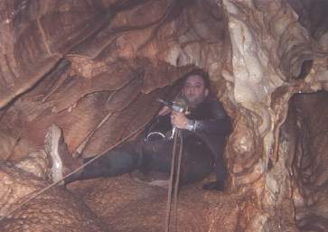 Après plusieurs montées et descente sur corde à faire suivre tout notre attirail de plongée nous arrivons devant cette mystérieuse étroiture verticale . Stéphane l’observe et me donne ses premiers sentiments . Je décide de m’engager dans celle ci après avoir enlevé tout mon matériel ainsi que mon casque . Au bout de 10mn d’effort je finis par trouvé la bonne clef de cette étroiture et équipe ce passage en corde.Après avoir tiré tout le matériel , Stéphane avec ses 1,95 m et ses 100 kg, quitte sa combinaison Néoprène et commence à négocier des coudes et des jambes pour accéder à ce passage difficile . Après 2 heures d’effort, plusieurs tentatives et malgré sa ténacité nous sommes obligés de faire marche arrière et nous prenons, après une pose casse croûte, le chemin retour.