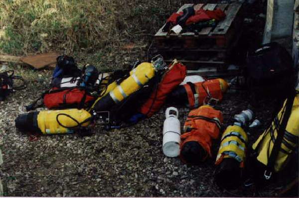 | Matériel utilisé : 2 bi-bouteilles de 9L gonflés à l’air, 1 bi-bouteille de 12L et 1 bi-bouteille de 18L (air) ; 4 relais Nitrox 50%(2x10 L, 1x 9L et 1x12 L) + 1 bouteille de 5L d’oxygène médical (pour le cas ou !). |