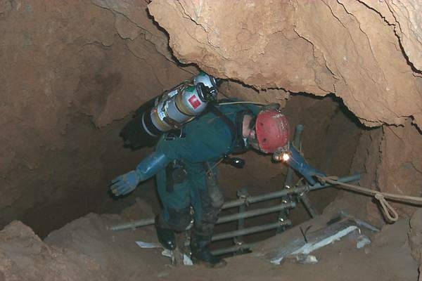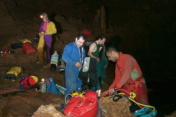 Quelques contorsions seront à consentir pour chausser les palmes dans le bassin où nous n'avons pas pied. Nous nous succédons sur une arête ténue constituant l'unique point d'appui avant de cabucer dans le S.5 (130m;-13). Les deux points hauts sur d'imposantes dunes d'argile et de sable agrémentent la progression, puis après une brutale remontée, c'est enfin l'émersion.