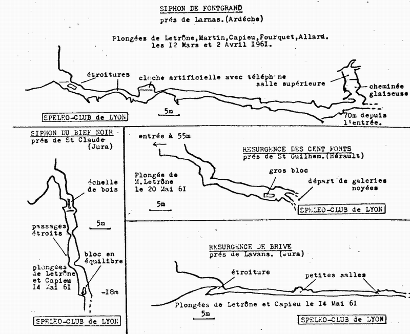 Il a trouvé une étroiture au départ, puis une seconde, mais franchissable avec des bouteilles. Il repart, et nous lui laissons cette fois les 35 mètres de tuyau. Capieu est arrivé, à cet endroit, à l'entrée d'une galerie toujours noyée, mais aux dimensions plus vastes. Martin, puis Letrône vont examiner les lieux et décident de reprendre la plongée une autre fois. Nous avons en effet repéré une cloche naturelle, et avons imaginé de la transformer en relai.