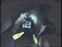 | En bout, un nouveau puits m’amènera à -120m. Je ne trouve rien pour amarrer mon fil, alors je sors le plomb, récupéré plus haut, de ma poche et j’accroche mon fil. Une fois attaché, je fais demi-tour sur moi-même et regarde la galerie profonde que Joseph Schneider, mon prédécesseur, avait décrite. La profondeur ne correspond pas tout à fait, il me manque 5m sur mon profondimètre, mais il n’y a aucun doute, c’est bien elle. Nos efforts commencent à être récompensés. Mais une mauvaise disposition de mon équipement, me font renoncer à poursuivre plus loin, et, par prudence, je préfère remonter, malgré une importante réserve de gaz restant sur mon dorsal. |