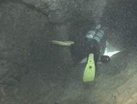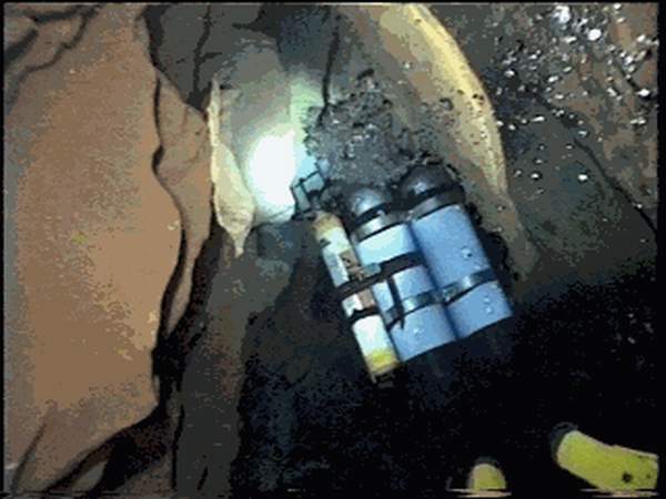 Puis c’est au tour de David Bianzani de continuer, et au bout d’une heure il m’annonce à la radio que le passage est assez grand pour pouvoir faire passer un plongeur. Dans la foulée, je m’équipe d’un bi 9 litres et me jette à l’eau. Une fois au fond, je passe mes pieds puis mon corps par l’ouverture et à l’aide de ma pelle US, fais descendre les cailloux dans la galerie, en les disposant sur le côté, pendant que David continue le pompage. Une fois l’ouverture assez grande, je ne retiens plus mon excitation, et je pars dans la galerie. Une très grande joie m’envahit de pourvoir palmer dans un lieu qui n’a plus vu de plongeur depuis 17 ans. Le fil est toujours en place, la roche est plutôt sombre et un dépôt de poussière se soulève à mon passage. Je fais 60m dans une galerie de 1.50m par 2m, et je m’arrête par -18m sur un puits vertical, devant la crépine d’aspiration qui aspire l’eau et la rejette au-dessus, sur le côté gauche de la vasque. Je fais très vite demi-tour et je remonte à la surface pour annoncer la bonne nouvelle aux copains. Nous passerons l’après-midi à stabiliser la trémie, sur le dessus. Maintenant un plongeur en gros scaphandre peu passer sans difficulté par l’étroiture.
