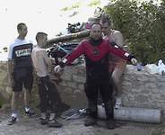 Il est 13 heures, et après une bonne salade de pâtes, je commence à m’équiper. Je m’habille en premier de mes sous vêtements en laine, et par cette belle journée très ensoleillée de juin, une fois dans mon étanche, je transpire à grosses gouttes. Je me dépêche de sauter à l’eau pour me rafraîchir un peu. J’ai disposé mon scaphandre composé d’un tri 20, sur le bord de la vasque, à l’ombre, et aidé par mes assistants, Jean Marc Belin, François Beluche, Laurent et Stéph, je m’équipe consciencieusement. J’ai décidé ce faire cette plongée en comité restreint, et il est plus facile, pour moi, de se concentrer dans ces conditions, par rapport à la dernière fois.