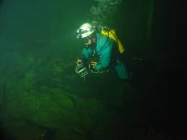 Pour la plongée dans le S5 nous avons pris l’option de nous organiser et de faire appel à un grand nombre de plongeurs. Nous savions qu’individuellement avec 2 x 4 L nous pouvions aller jusqu’au S5 et qu’il nous fallait 2 x 9 L pour prendre le temps de chercher la suite de l’actif, soit 6 charges plongées pour rechercher une suite en comptant bouteilles, nourritures et point chaud. On a fait appel à six plongeurs pour nous aider ; - 4 plongeurs : Yves Billaud, Gaby Hude, Jo Favre et Yves Perret ont acheminé les charges dans le difficile passage entre le S1 et S2, débarrassés de leurs bouteilles, ils étaient plus à l’aise. Tandis que Barnabé Fourgous, Laurent Ylla, Manu Tessane, Xavier Méniscus et David Bianzani portent leurs propres bouteilles jusque devant le S2. La plongée du S2 et S3 se déroula sans encombres, la visibilité était magnifique, malgré la température de l’eau à 5° C je prenais mon temps et profitais de la beauté des siphons. La deuxième partie difficile fût là, le passage de toutes les charges et bouteilles des porteurs dans la grande diaclase, l’organisation s’est déroulé comme prévu et les bouteilles passèrent de mains à mains et de corde à corde, pour se retrouver une heure et demie après la sortie du S3 devant le S4. Pendant la préparation des bi 9 litres dans les kits par Xavier et David, Laurent, Barnabé et Manu préparèrent le point chaud et le premier repas avant l’exploration vers le S4. Trois quart d’heure après, départ pour la plongée dans le S5. Laurent et Manu ont ouvert la marche dans le but d’explorer toutes les galeries entre le S4 et S5. Puis, Xavier et moi avons plongé dans le S4. En tête avec l’éclairage de mon HID j’ai pu apprécier les dimensions importantes de celui-ci, près de 5 mètres de diamètre pour une profondeur de 4 mètres, une galerie inférieure se dévoile devant nous et ressort 30 mètres après la sortie du S4. C’est cette galerie que Stéphane, Laurent et Gaby ont empruntée il y a un an, le fil dans le siphon n’a pas bougé depuis cet hiver ; c’est celui de Laurent et Frédo. Nous avons mis une minute pour franchir les 30 mètres du siphon. Nous nageons maintenant dans un lac qui mesure plus de 50 mètres. Au bout de celui-ci nous retrouvons Laurent et Manu qui ont déjà quitté leurs bouteilles et partent à la découverte des galeries exondées.