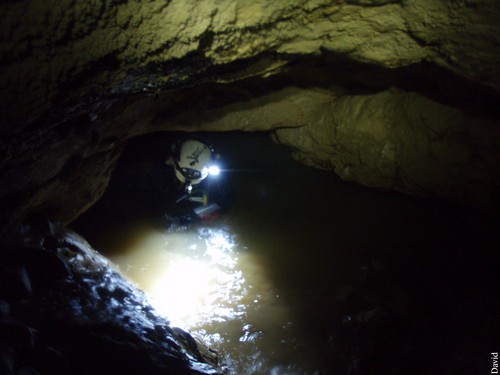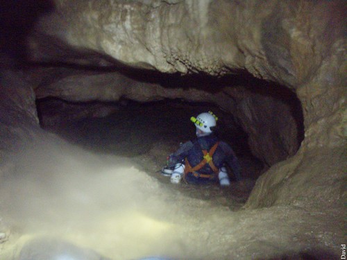 Le rendez-vous avait été fixé à 10h00 à Pont en Royans, mais voilà nous débutons avec une demi-heure de retard Gaby a eu un problème d’oreiller ou traversin je ne me souviens plus de son histoire matinale. La neige est là pour agrémenter notre portage, les conditions sont idéales le talweg n’est pas trop glissant pour accéder à la grotte.Nous prenons de l’avance avec Dirk pour planter deux spits en haut du ressaut de 4 mètres qui mène au réseau. En moins d’une demi-heure les spits sont plantés, la corde posée et les charges sont en haut du ressaut dans une petite salle.La cavité est très sympathique les dimensions sont de deux par trois, la galerie diminue après un passage ascendant, de petites vasques d’eau ponctuent le parcours. Gaby est arrivé entre temps nous l’aidons à monter ces charges de plongées, et comme je l’avait annoncé, on topographie à l’aller histoire de ne pas remettre à demain ce que l’on peut faire le jour même… D’après mes infos, je savais que le Siphon 1 était court, pas large et ni très clair. Je décide d’envoyer Gaby en éclaireur comme ça, il allait profiter de la visibilité le chanceux…il fera un aller retour histoire de nous en faire un compte rendu complet. Après immersion il nous annonce que le siphon est peu profond 2 m, très court 10 m, mais il comporte une étroiture. Rien de bien alarmant, on a prévu la config à l’anglaise (bouteilles sur les cotés). La plongée ce passe sans encombres. Le réseau derrière est très boueux les dimensions sont de 1.5 m par 2 m . Quelques départs à droite et à gauche méritent une inspection plus attentive, nous nous contentons du réseau principal. Sur le parcours, une vasque d’eau attire notre attention, à une cinquantaine de mètre du S1. Nous y mettrons les palmes tout à l’heure. Un joli puits de deux mètre agrémente le parcours qui conduit au S2. Par contre toujours autant de boue, bonjour l’état du matos ! Après environ cent cinquante mètres, nous voici devant le S2. Surprise, pas de fil. Peut être que le niveau d’eau est monté ? Comme le S1, il donne l’impression d’être limpide, mais bon, la photo du départ en témoigne : il se trouble en quelques secondes, je ne m’engage pas trop dans la vasque pendant le temps qui m’est imparti pour ma préparation, histoire de garder de la visibilité. En cinq minutes je suis prêt mes camarades ont amarré le fil. Je teste les détendeurs, et me voilà parti. Je distingue devant moi après le nuage de touille, la suite de la galerie qui plonge à un mètre de profondeur, puis qui remonte. Je vois le fil jaune fluo du dernier explorateur (Dominique Belle) amarré à un becquet rocheux, mon intuition était la bonne, le niveau d’eau est monté. Je fixe de nouveau mon dévidoir, et je poursuit mon exploration après trente mètre de fil tiré et le passage de deux nouvelles étroitures, je scrute le sol qui est jonché de petits blocs j’insiste sur le plafond : rien, lisse (pas de trémie ouf…). Au retour Gaby mis les palmes et un bloc dans la vasque vue auparavant. Malheureusement, celle-ci de donna rien, elle part en diaclase inclinée puis débouche trois mètres plus loin sur une galerie latérale qui conduit dans le réseau en direction de la sortie. Je vais questionner Robert –Jean et Dominique Belle qui en connaissent bien plus sur cette cavité. La suite bien sur dans le prochain épisode. Pour info la cavité n’est pas très grande avant le S 1 mais mérite un coup d’œil il y a une petite colonie de Chauve souris j’en ait compté quatre à ne pas déranger bien sur. David Bianzani
